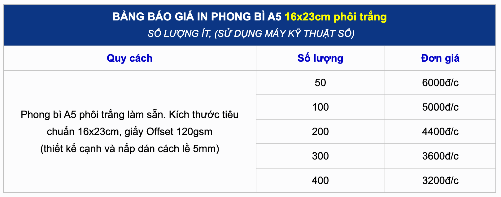 Bảng giá tham khảo in phong bì 16×23 từ 1, 2, 3 tới 4 màu kỹ thuật số